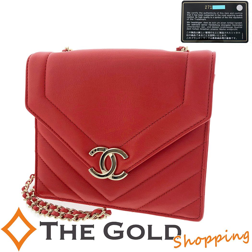 5. シャネル■シェブロン ミニ チェーンショルダー バッグ カーフ レザー レッド 赤 斜め掛け Vステッチ エンベロープ型 CHANEL【中古】
