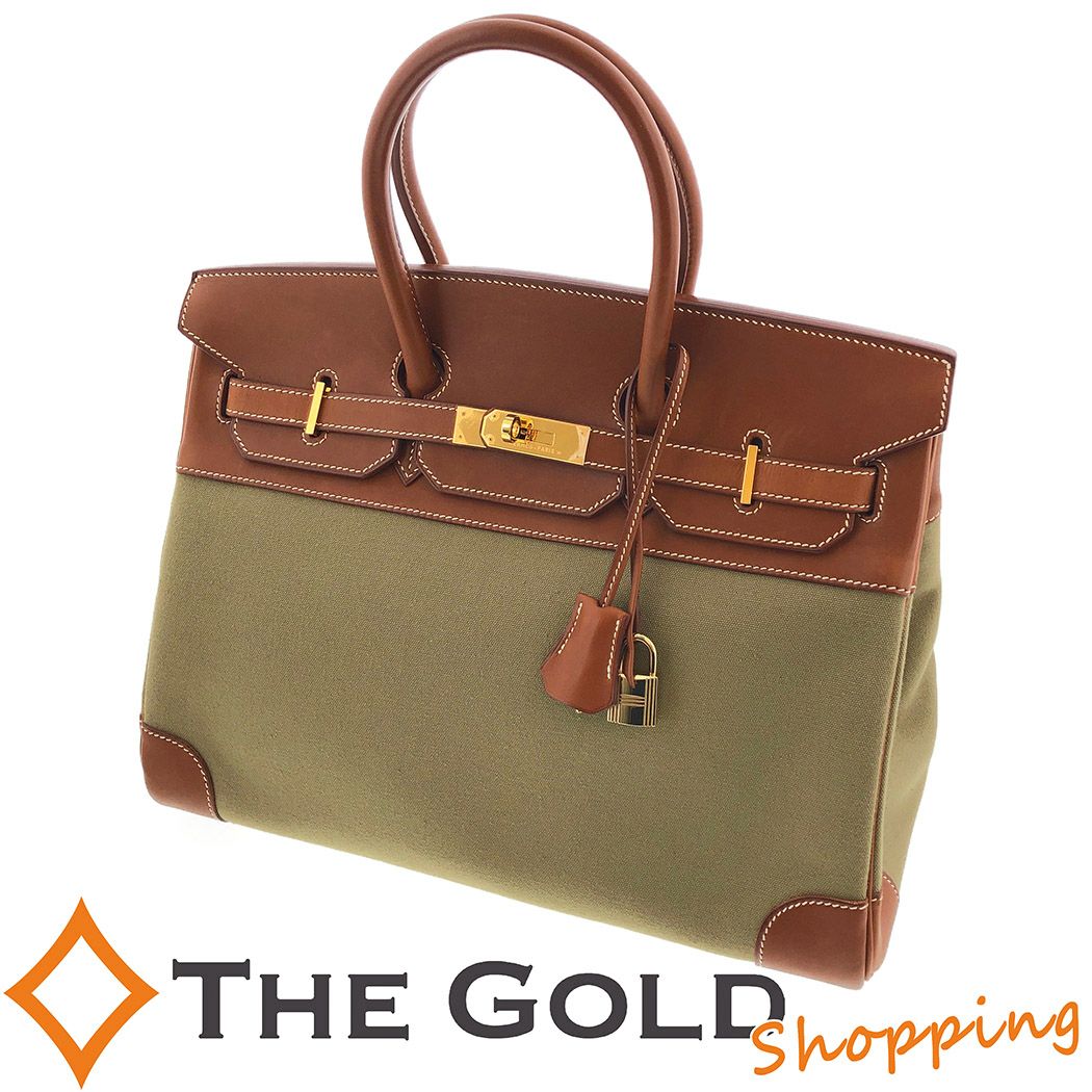 3. エルメス バーキン35 □F刻印 バレニア トワル レザー キャンバス カーキ ブラウン HERMES ハンドバッグ 【中古】