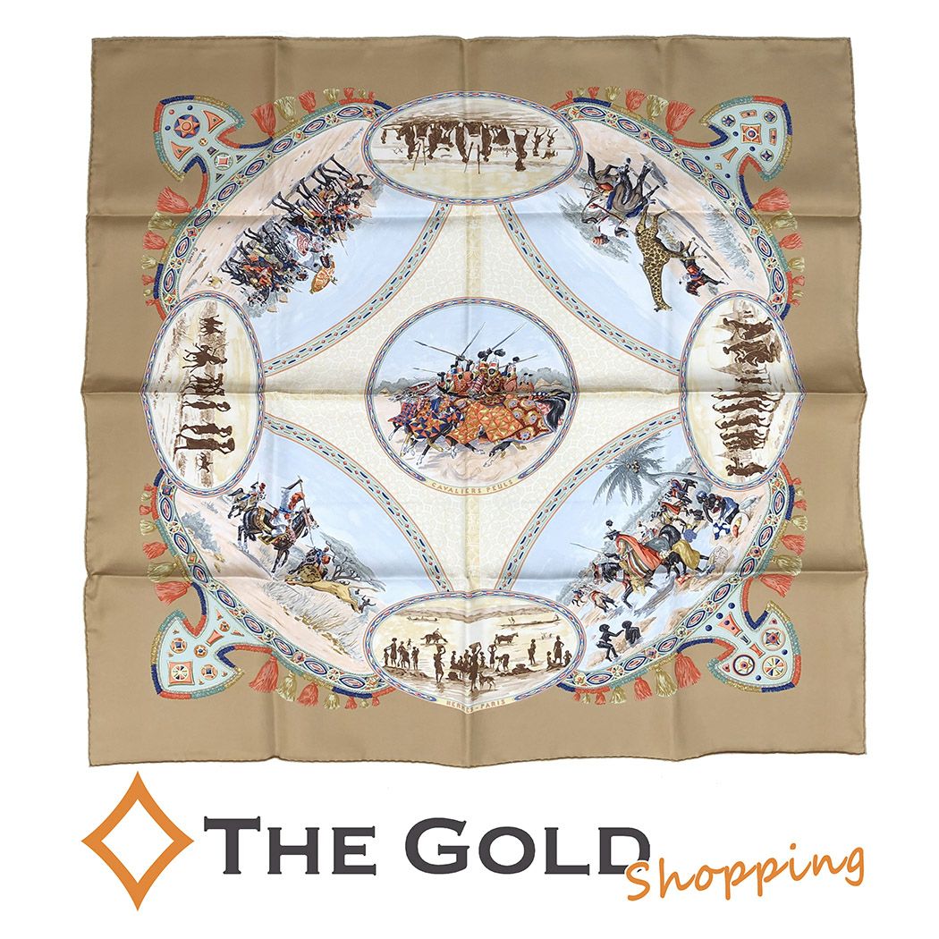 4. エルメス■ カレ90 CAVALIERS PEULS プール族の騎手 シルク100% ベージュ 大判 正方形 HERMES ストール・スカーフ 【中古】